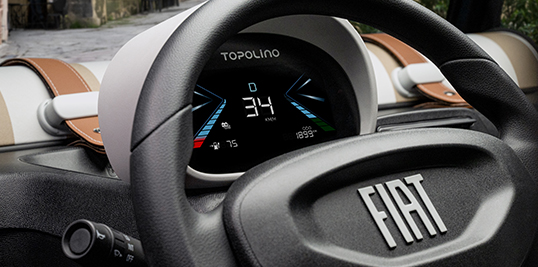 Topolino evoluciona también en tecnología con su nuevo cuadro de instrumentos digital, que pasa de 8,9 cm (3,5’’) a 14,5 cm (5,7’’), con una superficie total de panel de 21,1 cm (8,3’’). Este nuevo display ofrece gráficos simplificados, mejor legibilidad y un lenguaje visual más ligero y amable, reforzando la experiencia intuitiva y accesible del modelo.